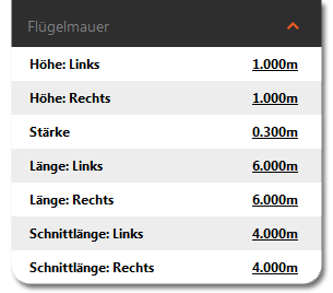 Anmerkung: Für Widerlager mit Flügelmauerstil können weitere Eigenschaften im Stapel bearbeitet werden: - Klicken Sie auf die Miniaturansicht in der Widerlager-Gruppe, um eine detailliertere Ansicht des aktuellen Widerlagerstils anzuzeigen (Flügelmauer-Widerlagerstil in Abbildung unten).