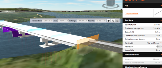 Überprüfen und ändern Sie Tafelsegmente, um die absolute oder relative Position der Tafelquerschnitte in der Brücke zu steuern, und ändern Sie die Tafelabschnittsbemaßungen. Sie können Tafelquerschnitte im Ansichtsbereich hinzufügen, löschen oder versetzen.