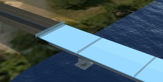 Beim Anwenden von Querneigung auf eine Komponentenstraße werden alle Brücken innerhalb der Komponentenstraße ebenfalls mit einer Querneigung versehen. Dies bedeutet, dass sich die Brückentafel neigen wird, um der Querneigung der Straße zu entsprechen. Anschließend können Sie Querschnitte der überhöhten Brückentafel im Stapel prüfen und bearbeiten. Wenn Straßensegmente mit Querneigung sich bis auf die Brücke erstrecken, werden kritische Querneigungsstationen auf der Brückentafel markiert.