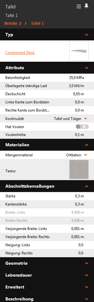 - Ändern Sie Stärke, Kantenstärke, konisch zulaufende Breite und Neigung für die gesamte Brückentafel.