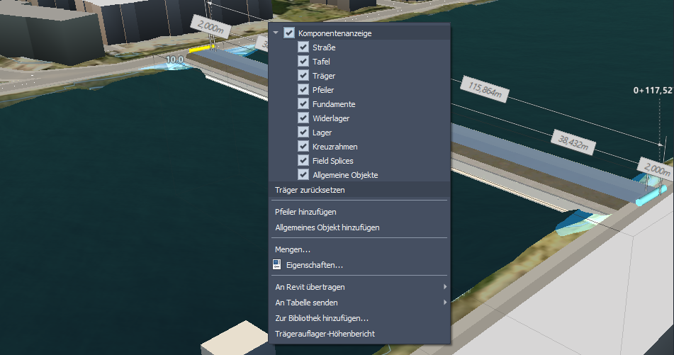 Verwenden Sie das Kontextmenü zum Steuern der Anzeige von Widerlagern, Fundamenten, Pfeilern, Tragwerken, Brückentafeln und Straßenoberflächen.