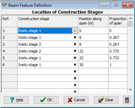 Bearbeiten Sie nach Bedarf die Positionen entlang der Spannweitenpositionen für Konstruktionsphasen.