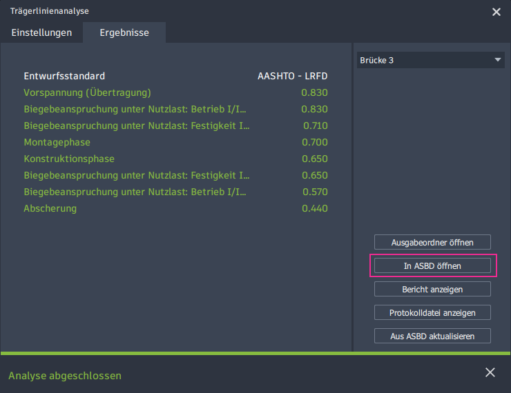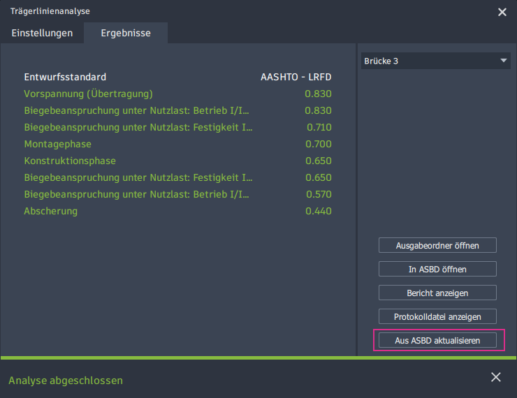 Klicken Sie in InfraWorks im Dialogfeld Analyse auf Aus ASBD aktualisieren.