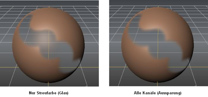 Opazität überschreibt nur den Streufarben-Kanal, sodass transparente Oberflächen weiterhin Reflexionen, Glanz, Relief usw. aufweisen. Verwenden Sie diese Option, um den Effekt eines transparenten Materials wie Glas oder durchsichtigen Kunststoff zu erzeugen.