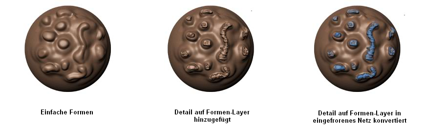 Mudbox weist jedem vom aktuellen Formen-Layer beeinflussten Scheitelpunkt einen Einfrierwert zu. Die Einfrierungsebenen ergeben sich aus der relativen Verschiebung jedes Scheitelpunkts im Vergleich zum Scheitelpunkt mit der größten Verschiebung. Diesem wird der größte Einfrierwert zugewiesen.