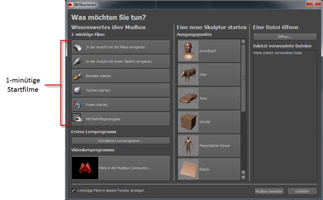 Finden Sie einen Einstieg in das Erlernen von Mudbox, indem Sie sich die einminütigen Filme ansehen, die im Fenster Willkommen beim ersten Start von Mudbox zu sehen sind. In diesen Filmen werden grundlegende Fertigkeiten für die Verwendung von Mudbox beschrieben. Die Filme können auch über das Menü Hilfe (Hilfe > 1-minütige Startfilme) gestartet werden.