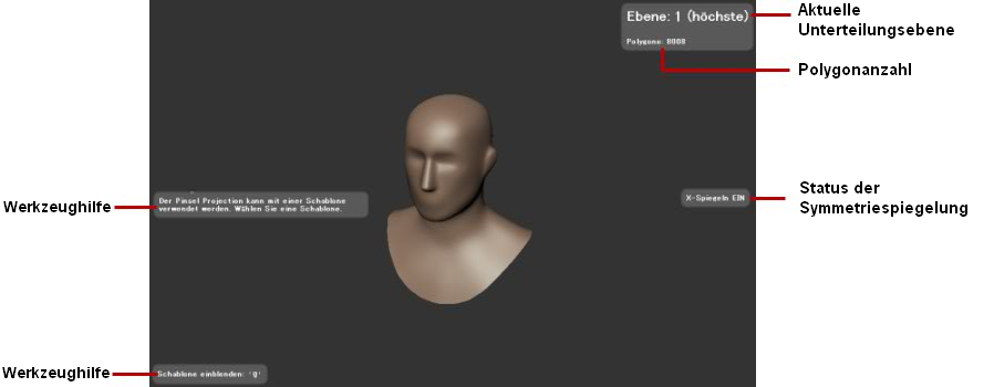 Die Kontextanzeige (Heads-Up-Display, HUD) wird automatisch in der 3D-Ansicht angezeigt und bietet hilfreiche QuickInfos (Tastaturbefehle und die Infos zur Verwendung einer Funktion usw.) sowie Statusinformationen (aktuelle Unterteilungsebene, die Anzahl der Polygone usw.).