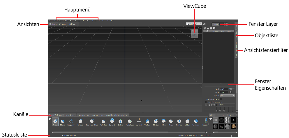 Die wichtigsten Bereiche der Mudbox-Benutzeroberfläche werden in den folgenden Abschnitten zusammengefasst:
