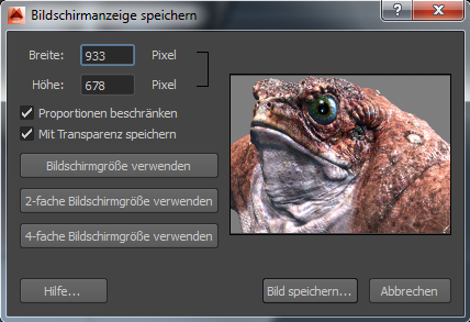 - Um ein Bild zu speichern, das die zwei- oder vierfache Auflösung der 3D-Ansicht hat, klicken Sie auf die Schaltflächen 2-fache Bildschirmgröße verwenden bzw. 4-fache Bildschirmgröße verwenden.