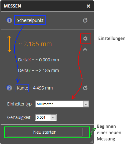 Messen | Wählen Sie die Option Messen. Klicken Sie an die Stelle, von der aus Sie messen möchten. Klicken Sie dann an dem Punkt, bis zu dem Sie messen möchten. Der gemessene Wert wird im Fenster Messen angezeigt. In 2D-Entwürfen oder -Modellen können Sie Folgendes messen: - Von Kante zu Kante