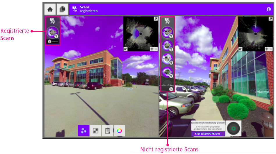 Die Auswahl unterschiedlicher aktiver Scans auf der linken und rechten Seite liefert basierend auf den beiden derzeit sichtbaren Scans verschiedene Erfolgsstufen beim Abgleich der automatischen Registrierung. Die Registrierung erfolgt jedoch für die gesamte Scangruppe. Der folgende Screenshot zeigt die Kombination aus manueller und automatischer Registrierung: