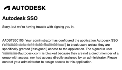 Wenn sich ein Benutzer anmelden möchte, erhält er möglicherweise eine Fehlermeldung, dass der Administrator die Autodesk SSO-Anwendung so konfiguriert hat, dass Benutzer blockiert werden, sofern ihnen keine spezielle Berechtigung gewährt (zugewiesen) wurde.