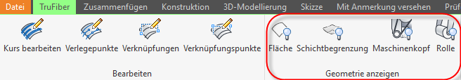 Verwenden Sie in der Umgebung Werkzeugweg bearbeiten die Schaltflächen in der Gruppe Geometrie anzeigen der Multifunktionsleiste Werkzeugweg bearbeiten, um Geometrie beim Arbeiten am Werkzeugweg anzuzeigen oder auszublenden. Sie können folgende Elemente anzeigen oder ausblenden: