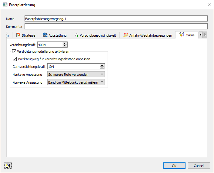 - Aktiviert die Verdichtungsmodellierung für die Faserbewegungsbahnen. Die Verdichtungsmodellierung simuliert die Konformität der Rolle zur Oberfläche und kann entsprechend Änderungen am Werkzeugweg vornehmen. Alle Schriftfelder im Rahmen mit dieser Option sind deaktiviert, wenn diese Option nicht ausgewählt wird.