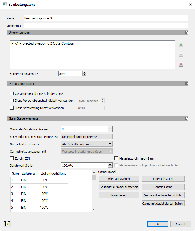 Geben Sie Garnbedingungen und -einstellungen ein, die innerhalb der Begrenzung existieren.