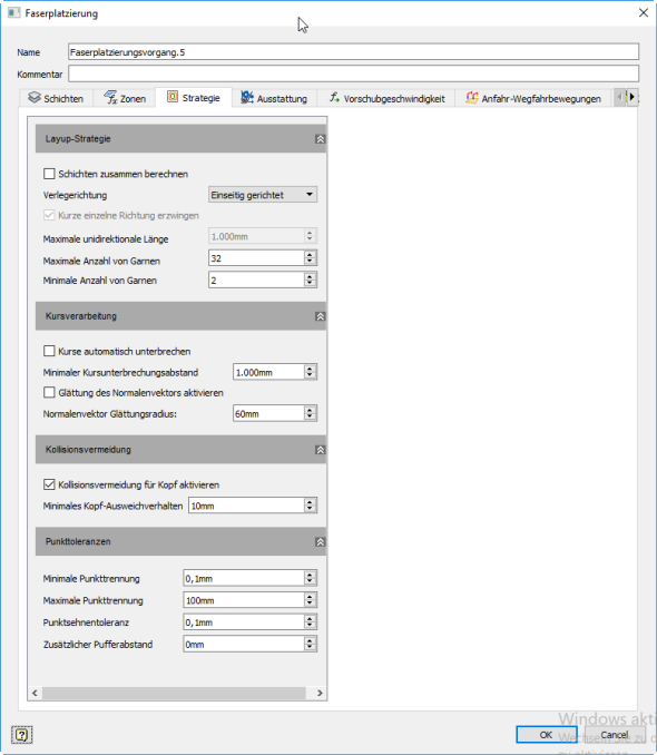 Die Registerkarte Strategie bestimmt die Berechnung der Schichten, die Richtung des Layup und spezifische Garnparameter für die Wege. Bearbeiten Sie ggf. die Werte so, dass sie mit Ihren Geräte funktionieren.