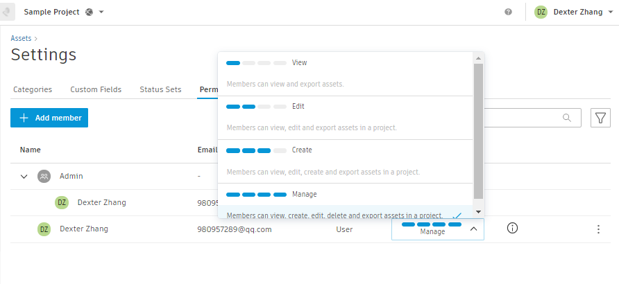 By default, project members don't have permission to view assets. They can access the Assets tool, but a project administrator will need to give them the basic permission to View assets. Project members can also have higher permission to edit, create and otherwise manage assets, as detailed in the following table.