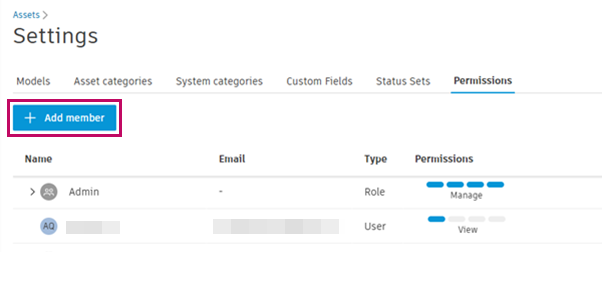 From the Permissions tab in Assets settings, click Add member.