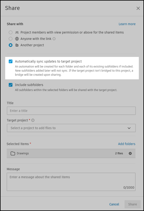 Select the target project and folder (if available). Title and message are optional. Learn more in the Files help about sharing and what projects appear here.