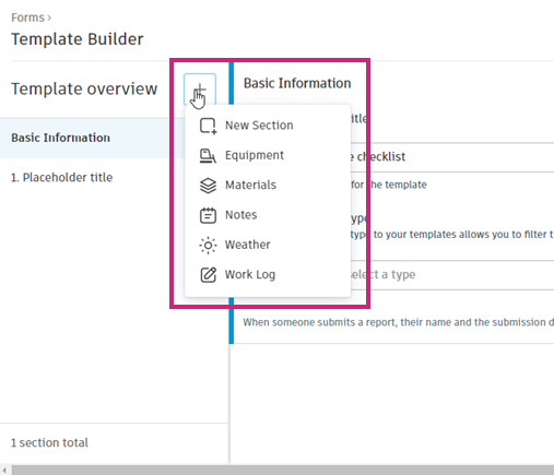 Depending on whether you chose a blank or preconfigured template, you can start customising the titles, questions, type of responses and more. To add a section, in the left panel next to Template overview, click the icon and select from the options.