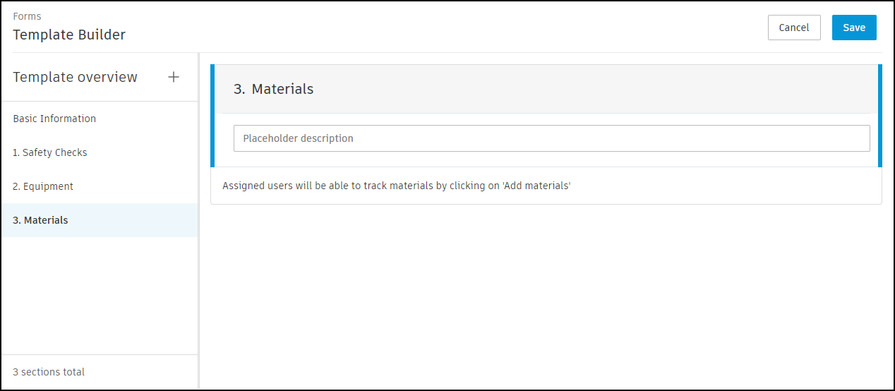 This adds a section with the Add materials option to allow your team to track materials. If needed, you can change the title and add a description.
