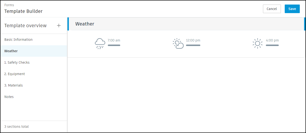 The weather section will always appear at the top of your template. This section uses your project's address to automatically gather weather data. If you haven't added an address to your project, you'll be prompted to provide an address when you add this field.