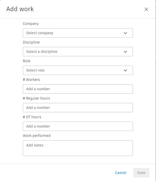 This section allows you to ask form fillers to provide labour information. You can ask them to provide information like the company, discipline, number of workers or hours, and more.