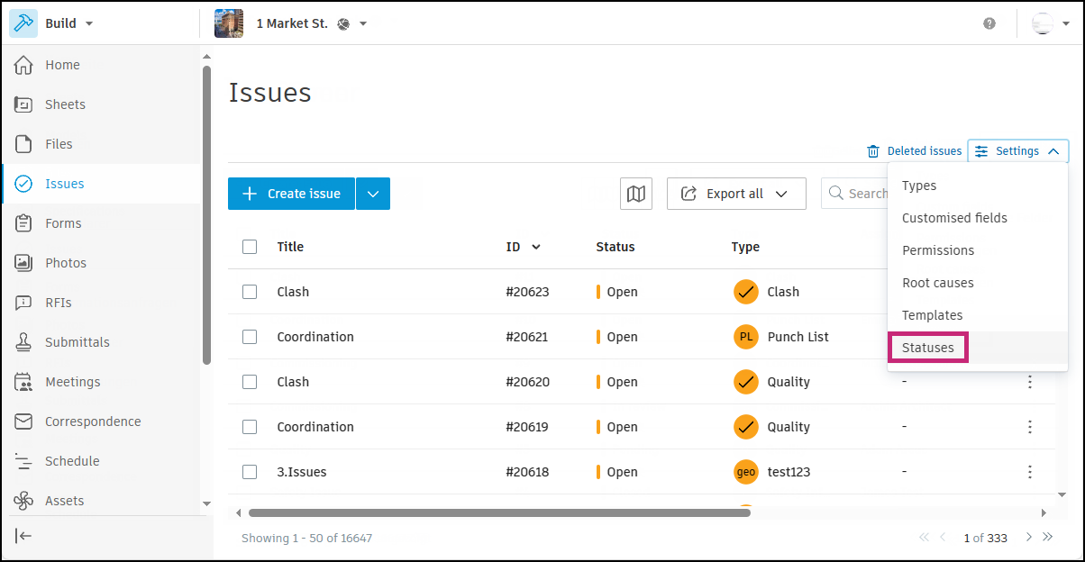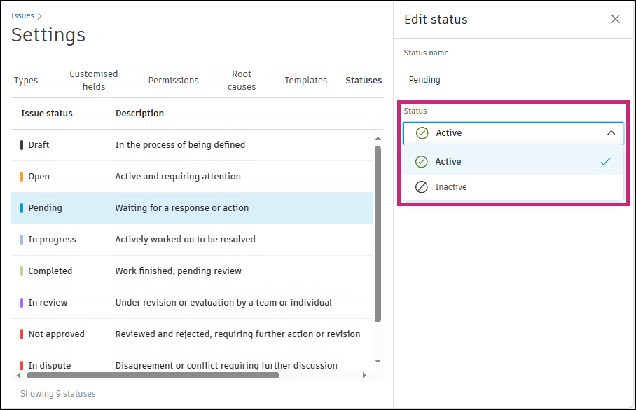 In the Issues tool, there is a preset list of statuses that your team can use to identify the stage an issue is in. Learn more about how these statuses can be used in different workflows.
