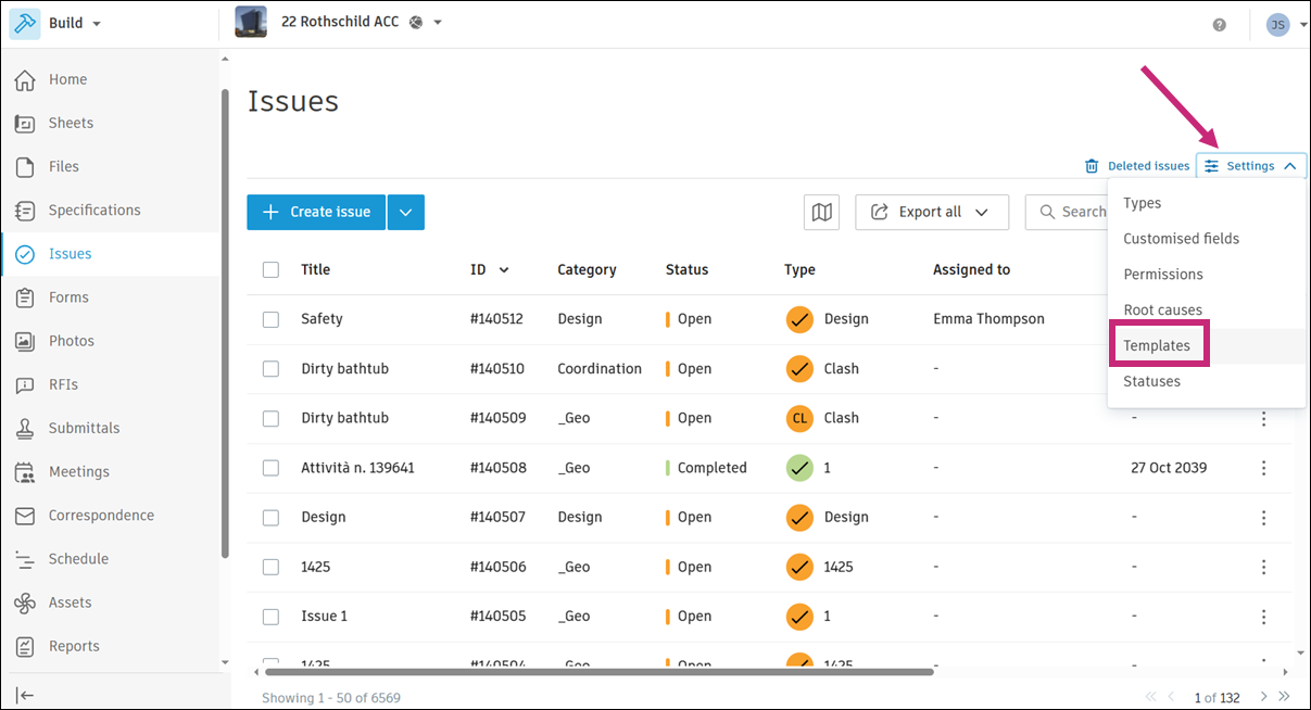 Click Settings on the Issues log and choose Templates.