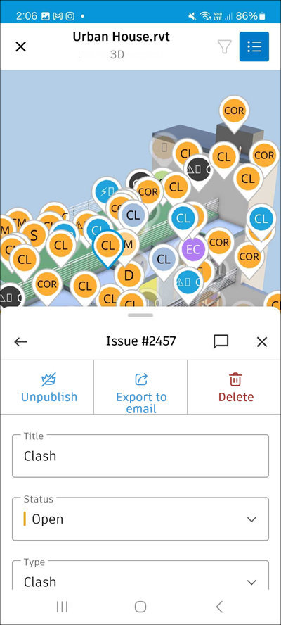 Tap the desired issue pin to open its details panel, where you can view, edit, comment, export, delete, publish or unpublish the issue directly from the model.