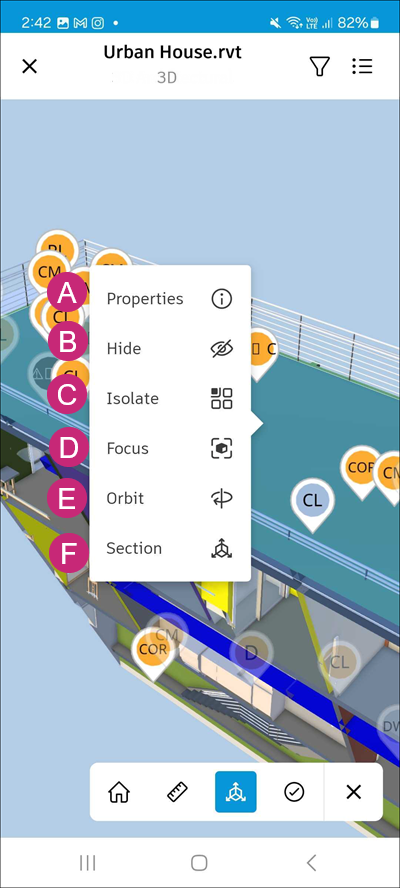C: Isolate: Tap to isolate the selected object, hiding all other elements in the model. This allows you to focus on the specific object without distractions.