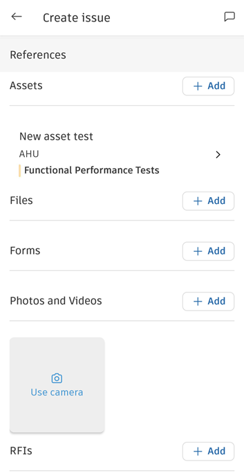 References: Navigate to the References section, tap Add next to the tool of your choice, and then select the file for which you want to create a reference. References are links to files that exist in other ACC tools like Assets, Forms, Files, Photos, Sheets, or RFIs. See Issue References and Attachments for details.