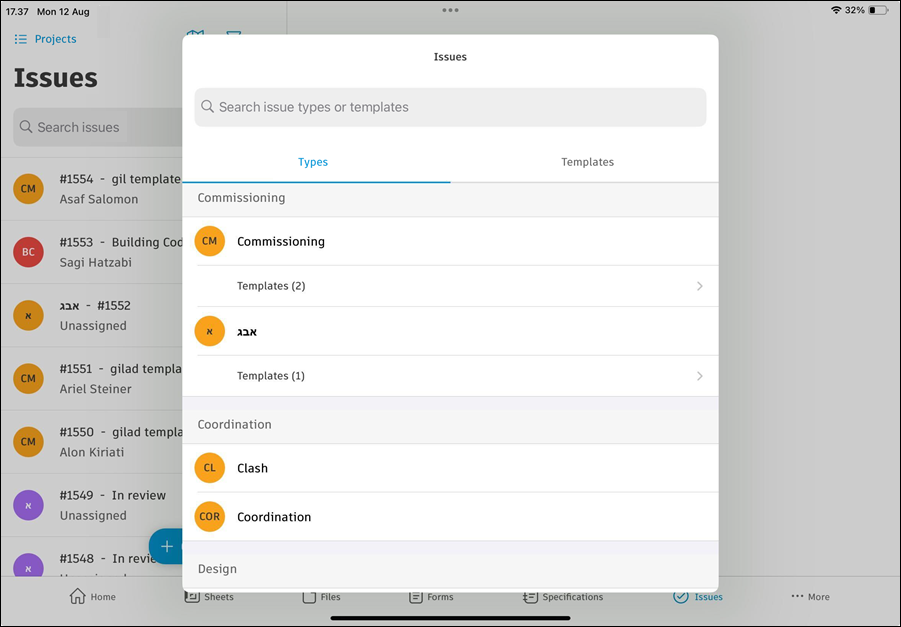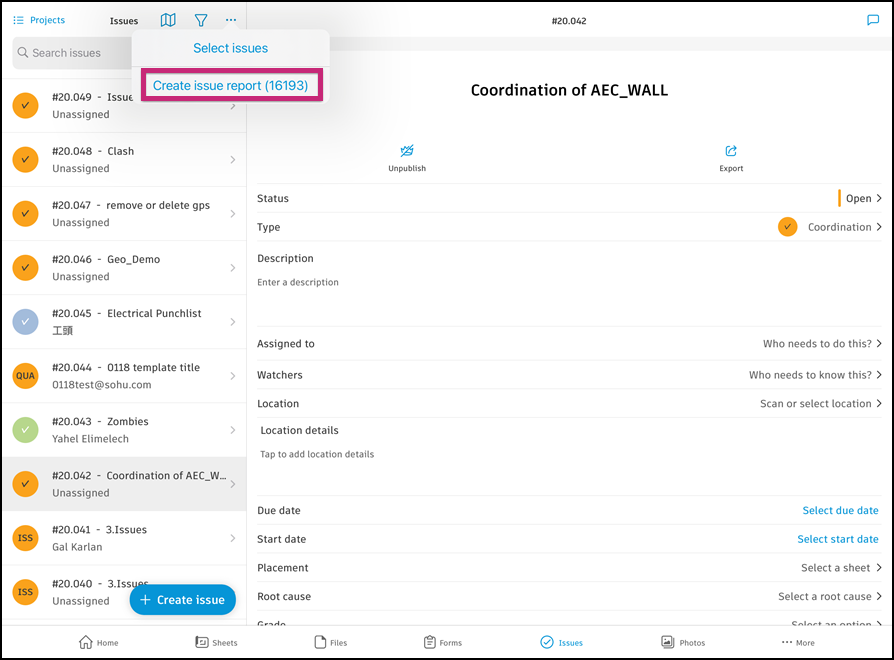 In the Issues tool in the Autodesk Construction Cloud mobile app, tap the