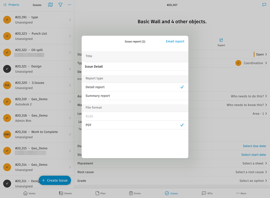 In the Issues tool in the Autodesk Construction Cloud mobile app, you can generate an Issues report and email it to yourself.
