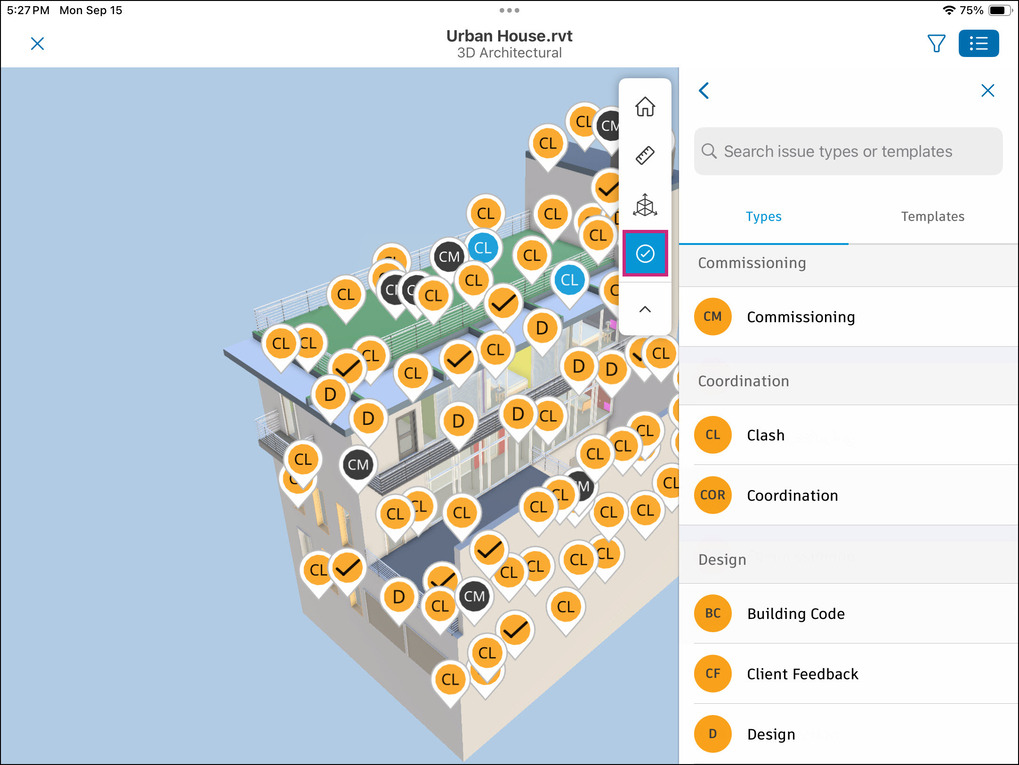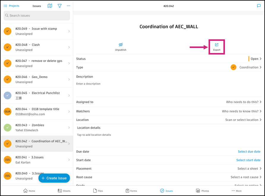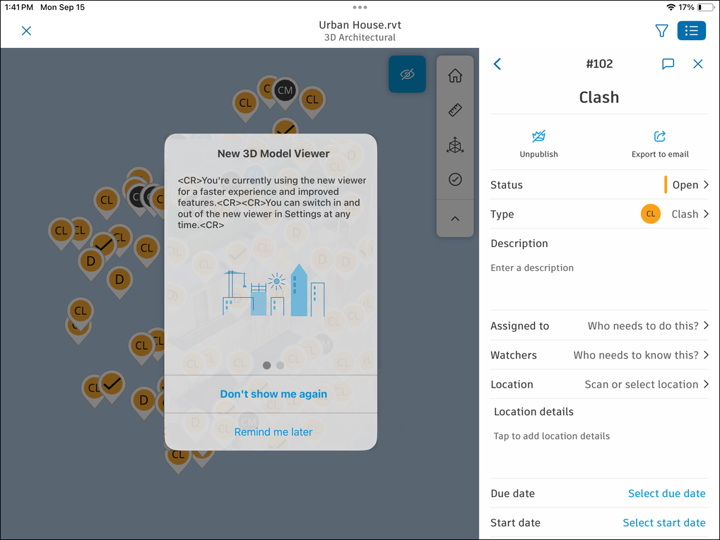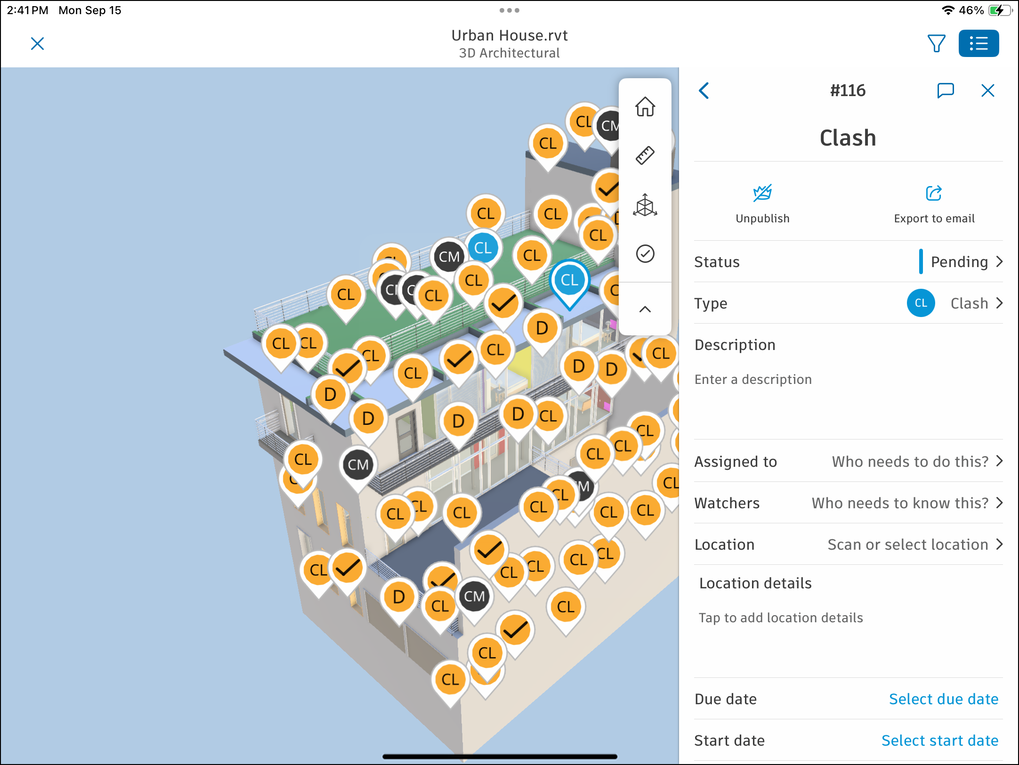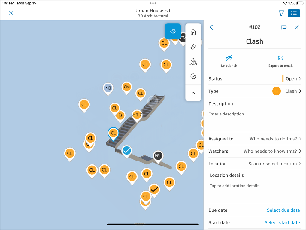 Tap the desired issue pin to open its details panel, where you can view, edit, comment, export, delete, publish or unpublish the issue directly from the model.