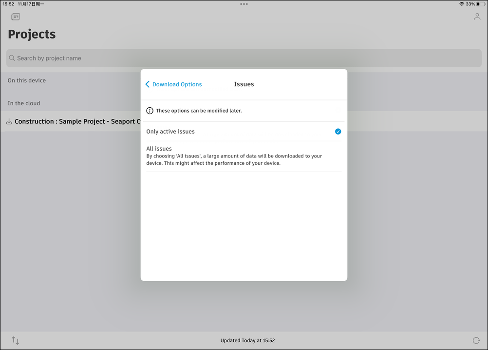 By default, when you download your project on your iOS device, only active issues are downloaded.