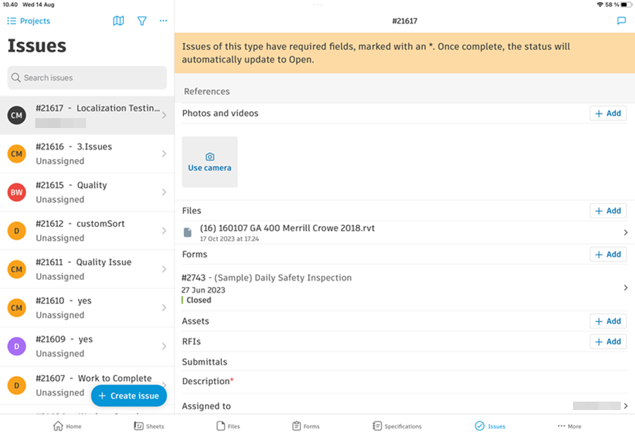 Use the Autodesk Construction Cloud mobile app on iOS to create, view and edit issues. Learn how to work with issues in the viewer on your mobile device.