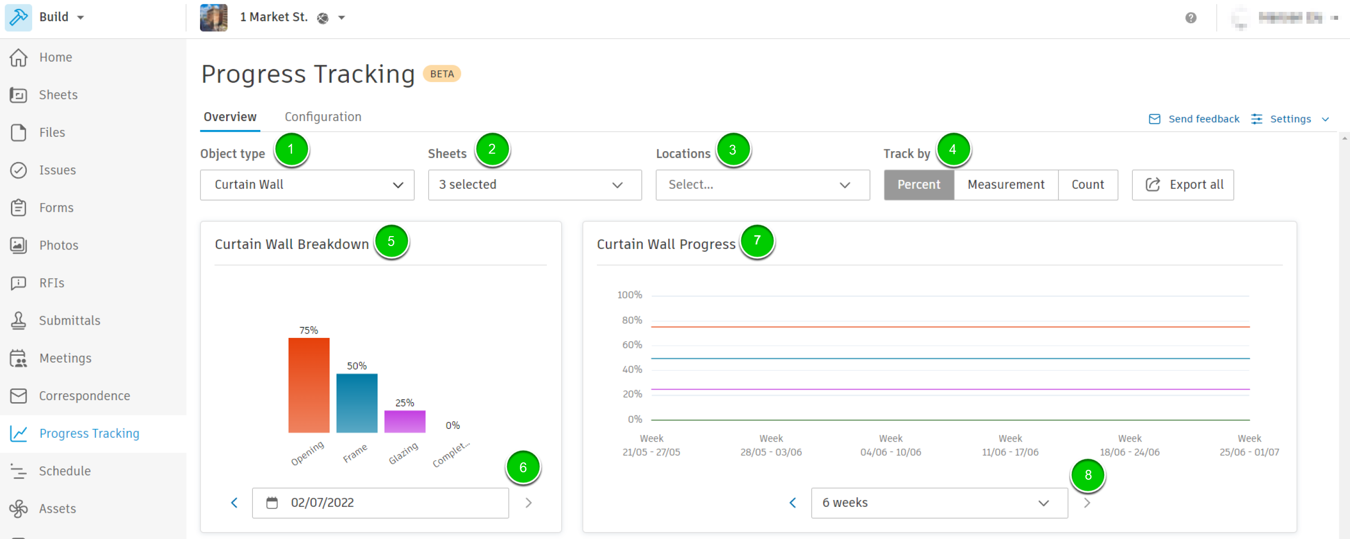 After you create progress mark-ups and update them, the Progress Tracking dashboard will populate with associated data.