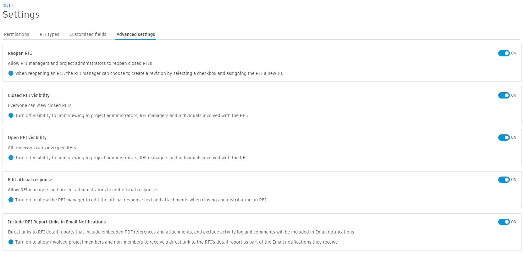 and choose Advanced settings.When this setting is turned off, visibility of open RFIs is limited to project administrators, RFI managers and individuals involved with the RFI.