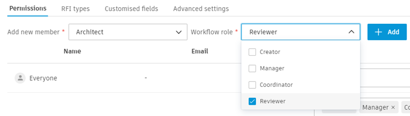 Select a member, role or company from the drop-down menu and choose a permission level. Available permission levels include: