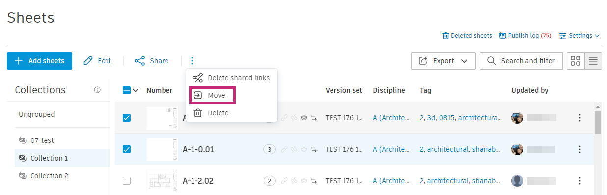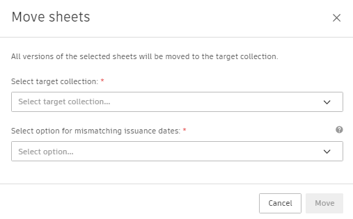 If version sets with the same name exists in the source and target collection but the issuance dates are different, members can choose to either not move the affected sheets, or move all sheets which will adopt the target collection version set issuance date.