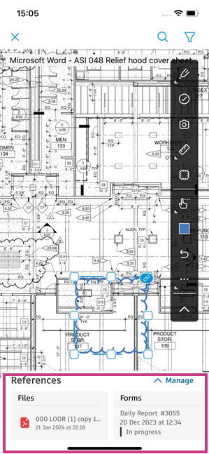 In the Autodesk Construction Cloud mobile app, you can add references to other sheets, files, RFIs, forms, submittals and assets on a markup.