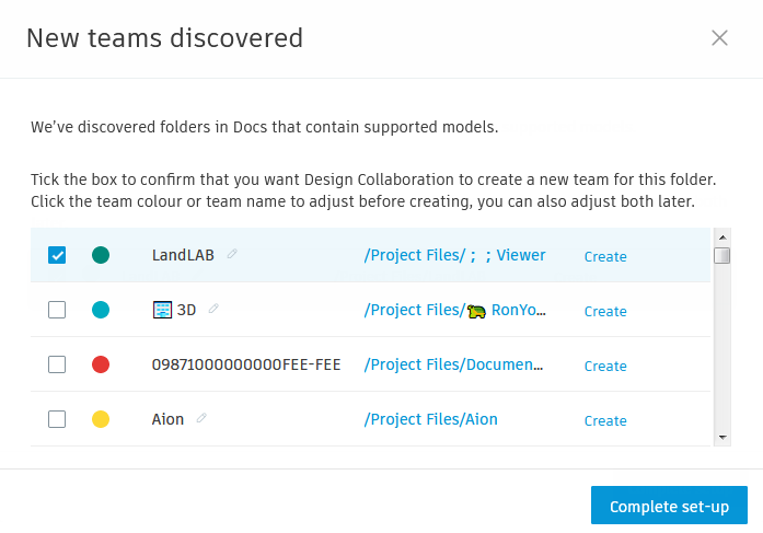 If you have models saved to a subfolder of Project Files, in the Files tool in Docs, Design Collaboration detects those files and displays a notification that prompts you to create a team for that folder. This can save time when setting up Design Collaboration for multiple teams or even for internal collaboration. The notification appears in the Home tool and the Settings tool.