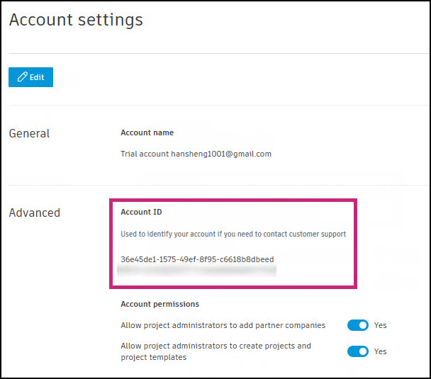 For support-related purposes or for connecting Customised Integrations (only for enterprise accounts), you need the unique Autodesk Construction Cloud account ID. To view: