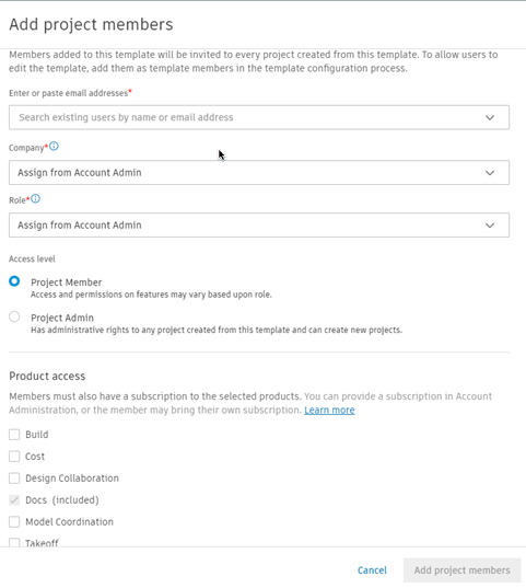 Note: If you don't select any of the tick boxes, the new members will be added to the account and made available to project administrators to add to a project. The newly invited members won't receive an invitation yet. Invitations are sent when a member is added to a project.