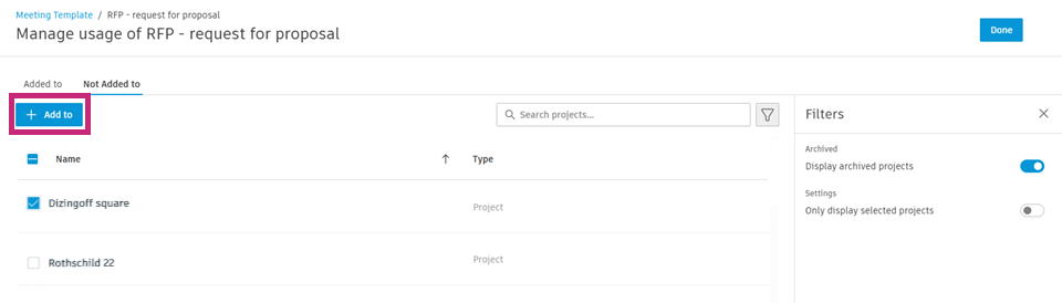 Click Add to. You will be redirected to Not added to tab with projects to which the selected template or templates have not been added.