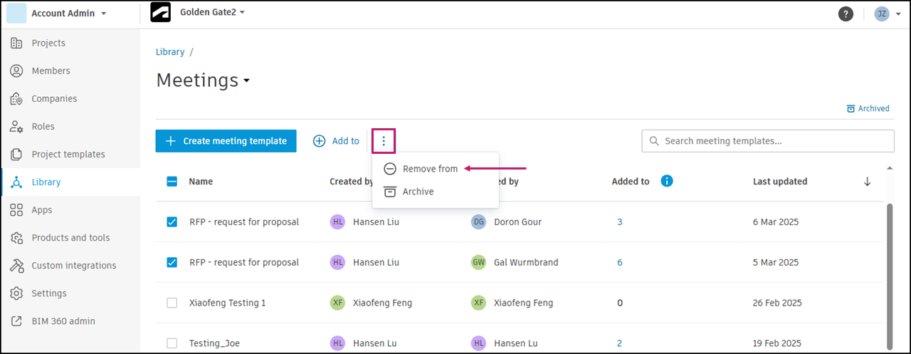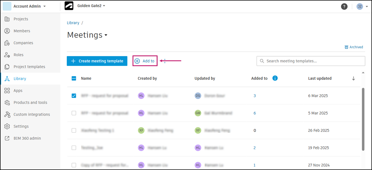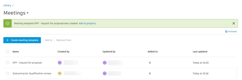 Account administrators can create meeting templates in Library for their account and add them to projects.