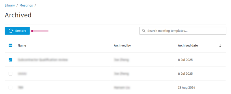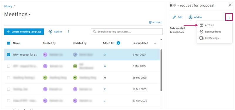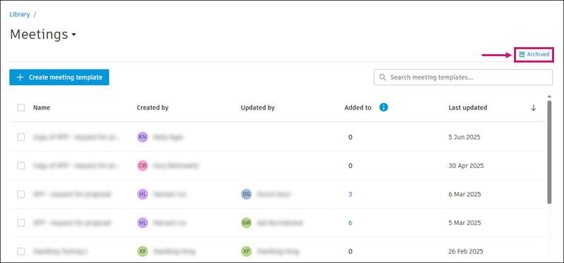 Archived templates will no longer be available for use in the projects they are added to. Archiving a template will not affect meetings previously created from it.
