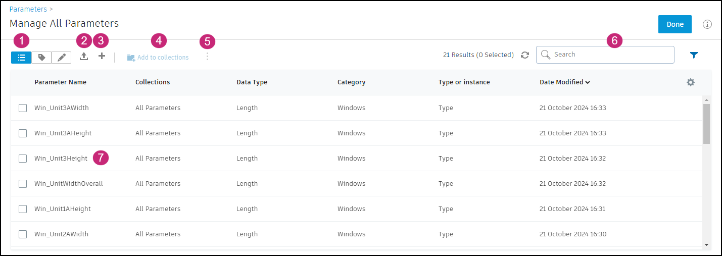 Reference the numbers on the following screenshot and find the matching information to learn how to view, create, edit, export and archive parameters: