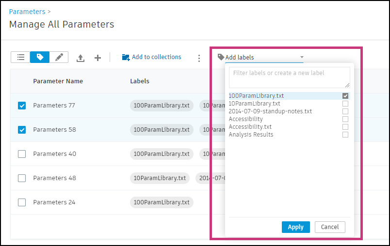 Next, use the Add Labels flyout to attach or detach labels on the selected parameters.